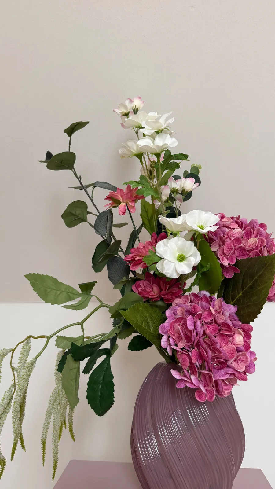 Evighedsbuket Lyserød Hortensia m. Flerfarvede Blomster bringer et feminint og friskt pust til indretningen. De lyserøde hortensiaer skaber et romantisk udtryk, mens den flerfarvede Frida-buket tilføjer liv og spil i farverne. Eucalyptusgrene og lysegrønne græsstrå fuldender looket med et naturligt og luftigt præg. En smuk og tidløs buket, der holder sig elegant år efter år.