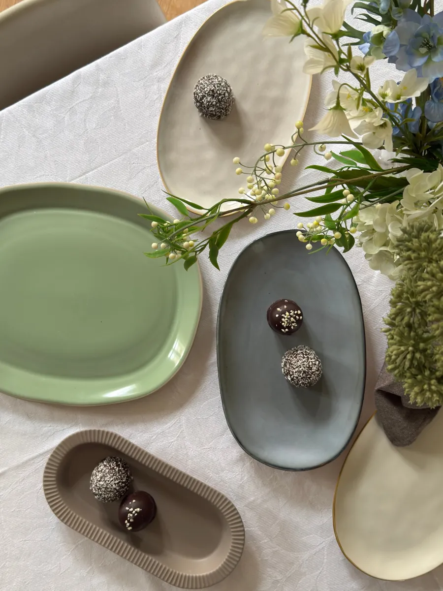 Server dine retter med elegance på det smukke Fie serveringsfad. Med sin bløde ovale form og dybe grønne glasur bringer fadet en naturlig og rolig stemning til borddækningen – perfekt til både hverdag og festlige anledninger.