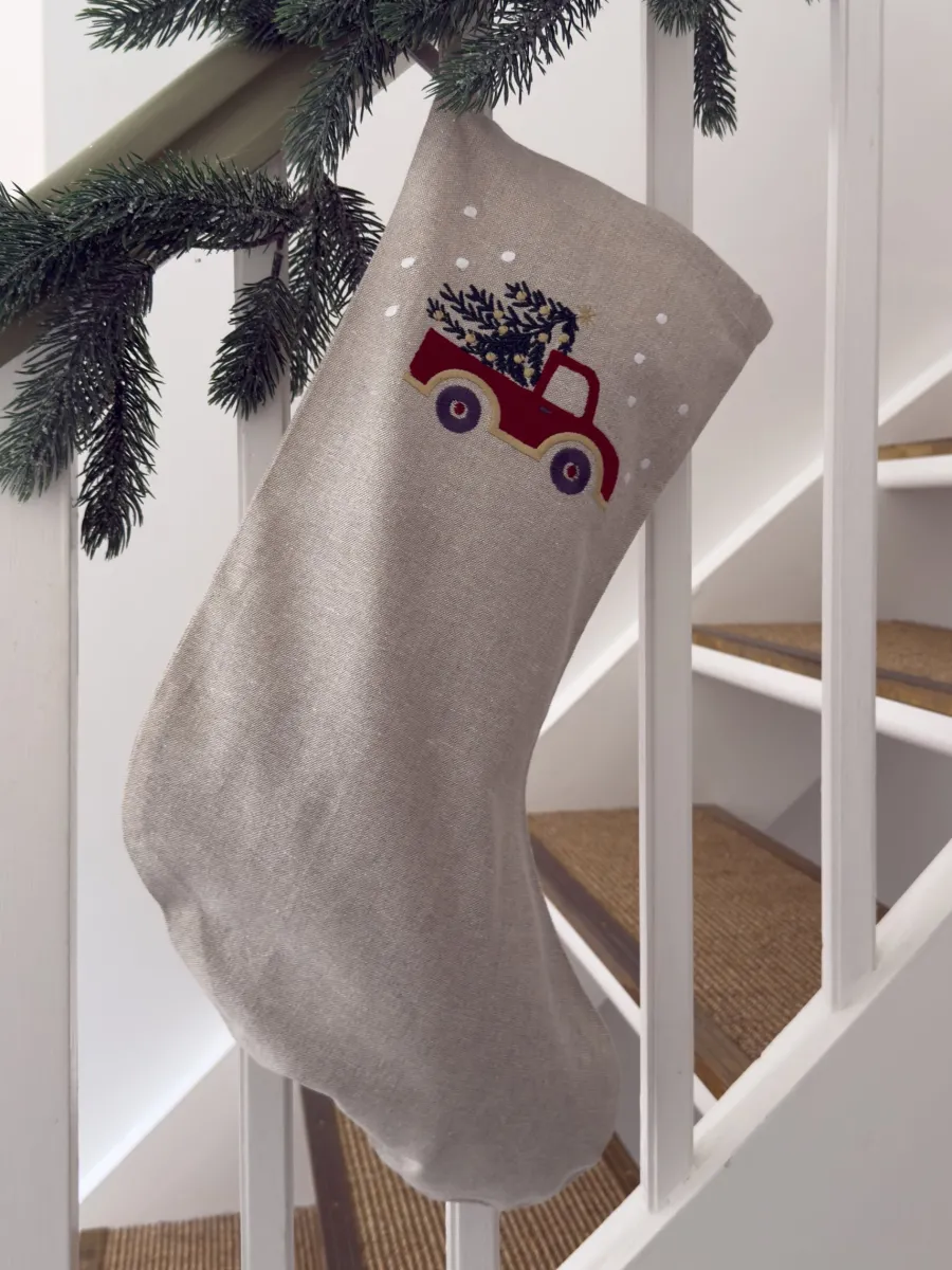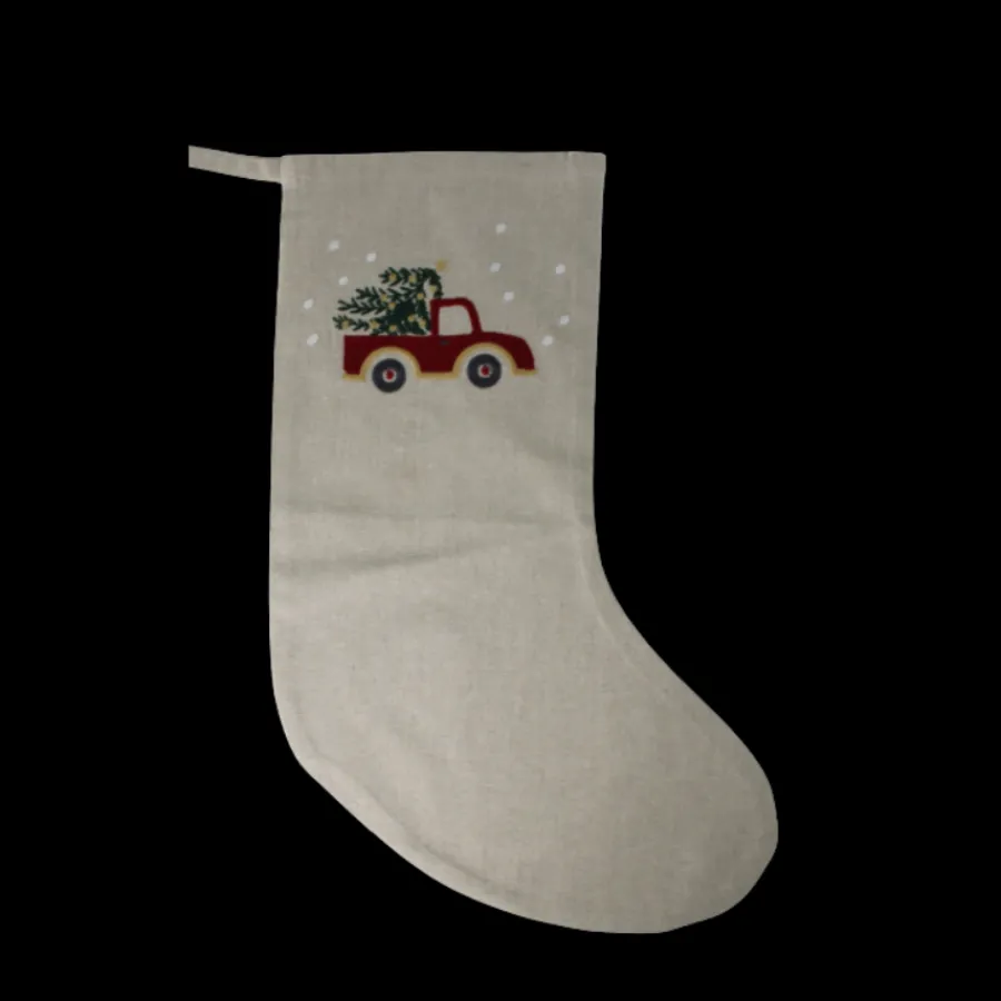 Julestrømpe med bilmotiv (H48x30 cm) er en hyggelig og charmerende detalje, der spreder julestemning i hjemmet. Den naturlige tekstilstruktur giver et varmt og rustikt udtryk, mens motivet med den røde bil, der bringer juletræ hjem, tilføjer et legende og nostalgisk præg. Strømpen har en praktisk størrelse, der gør den ideel til små gaver, søde overraskelser eller julegodter, som kan glæde både store og små. Hæng den på pejsen, i vinduet eller på en knage for at skabe en stemningsfuld og personlig juledekoration, der kan bruges år efter år.