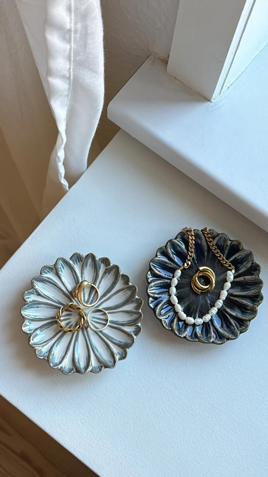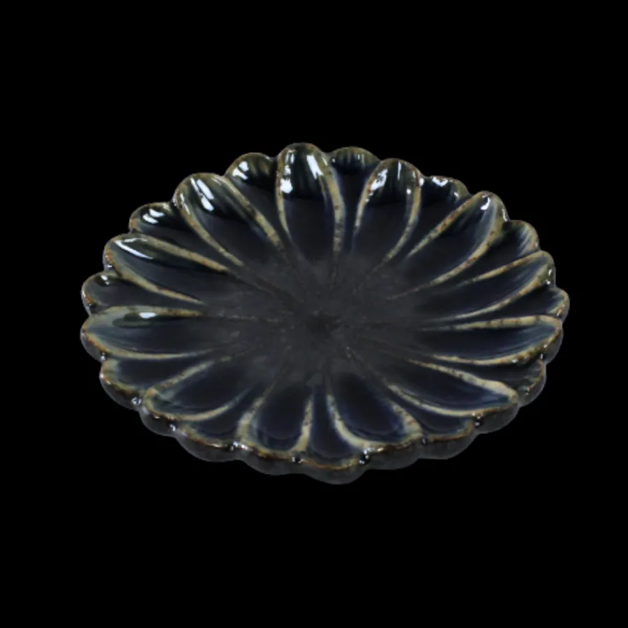 Tilføj et unikt og stemningsfuldt element til borddækningen med Lille Skål BENIT. Den er formet som en blomsterkrans med markante kronblade og har en smuk, glaseret overflade i dyb mørkegrøn med nuancer af blå og beige, der fremhæver strukturen og giver et håndlavet udtryk.