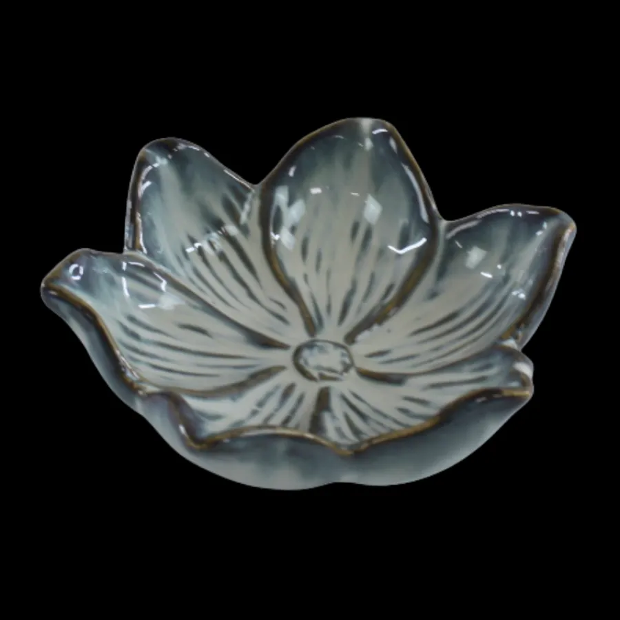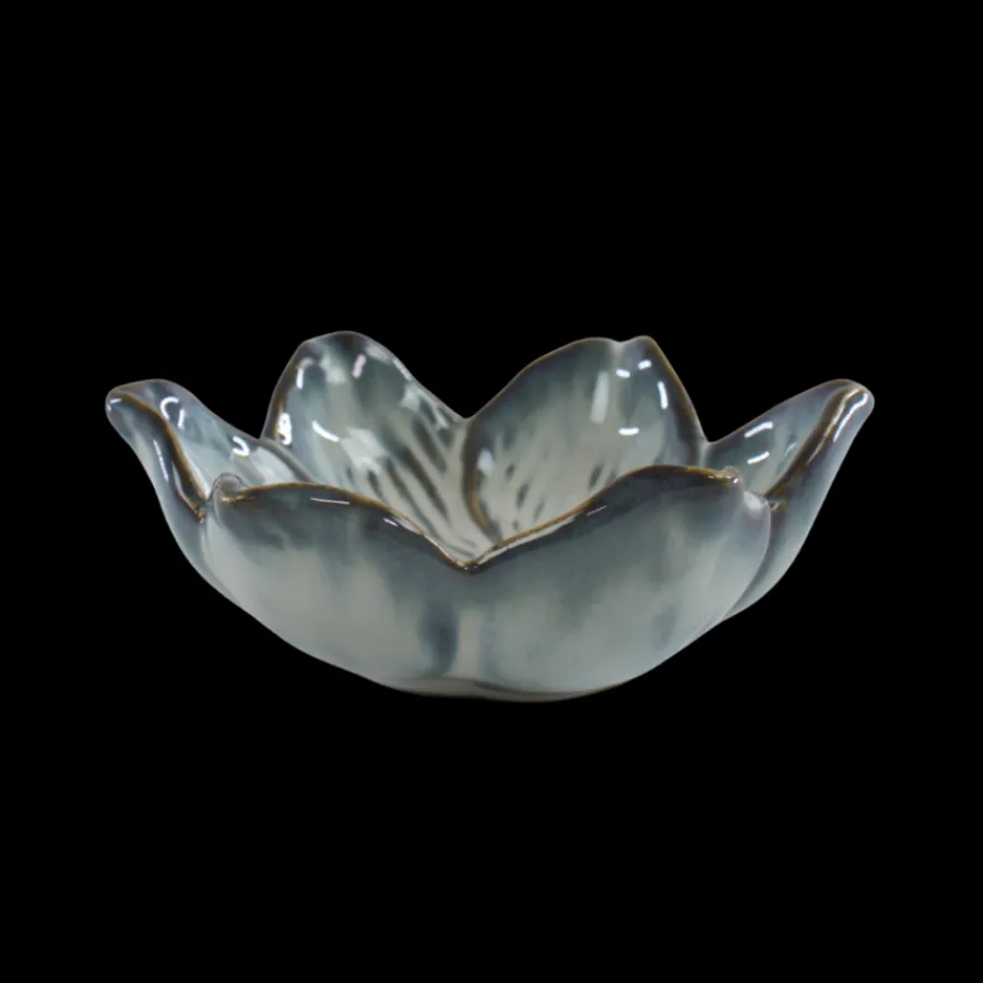 Tilføj et strejf af elegance og naturinspiration til dit hjem med Lille Skål CABRIE i hvid. Skålen er formet som en blomst med fem kronblade og har en smuk glasur i hvide og blålige nuancer, der fremhæver de fine håndlavede detaljer.
