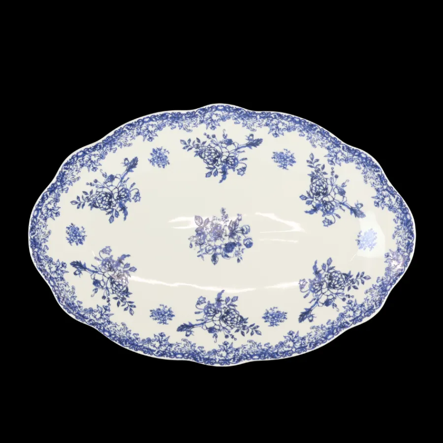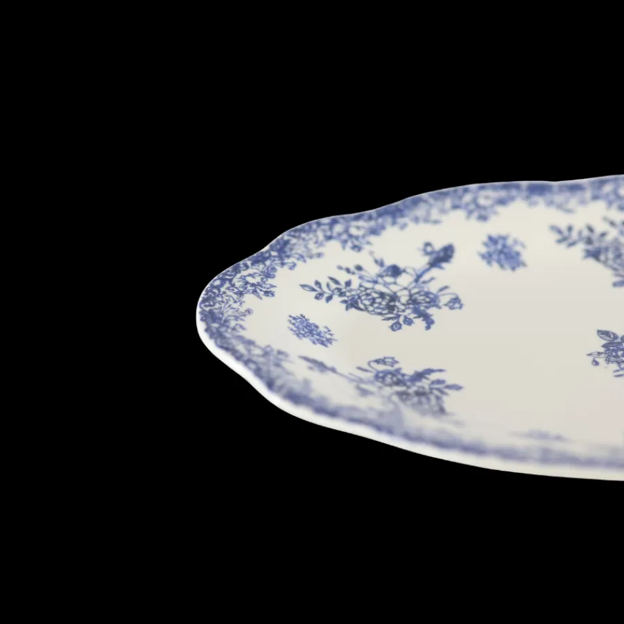 Oval Fad DINNA i blå bringer et strejf af klassisk elegance til bordet. Det fine blomsterprint i blå nuancer på hvid baggrund giver et romantisk udtryk. De bløde bølgede kanter tilføjer et elegant touch, mens den ovale form gør fadet ideelt til servering af kager, frugt eller småretter. Perfekt til hverdag og fest, hvor du ønsker et smukt udtryk. Kombinér med resten af DINNA-serien for en fuldendt og stilfuld borddækning.