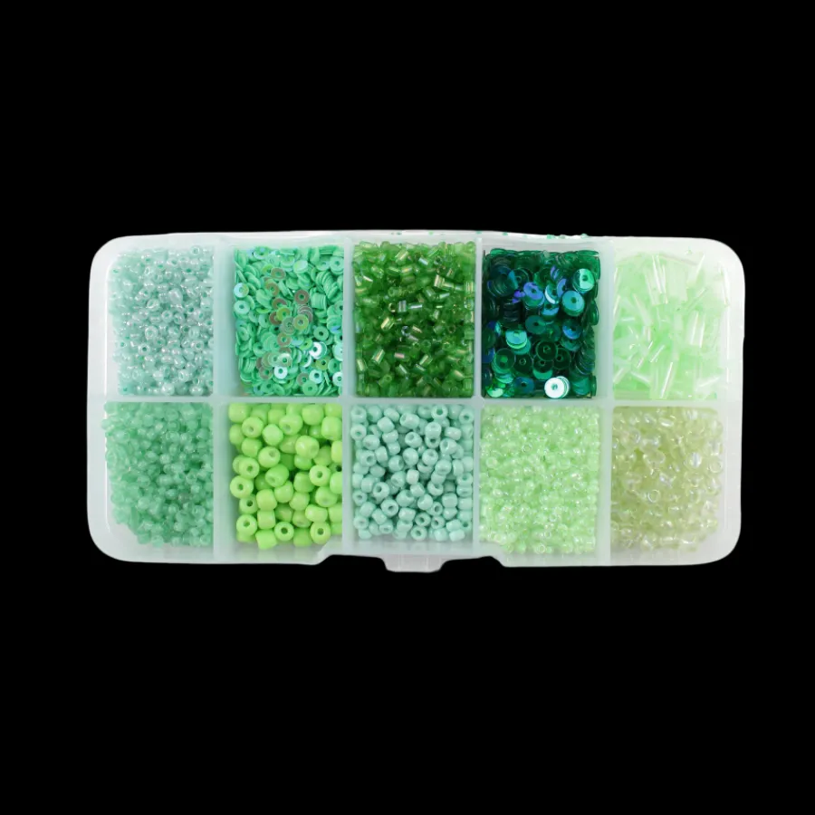 Giv dine kreative projekter et friskt pust med denne æske fyldt med perler i forskellige grønne nuancer. Æsken er inddelt i 10 rum, så du nemt kan holde styr på de forskellige perler og finde præcis den farve eller størrelse, du skal bruge. Perfekt til smykkefremstilling, dekoration eller andre kreative hobbyer. Denne praktiske og overskuelige æske er et must-have for alle, der elsker at skabe med perler.