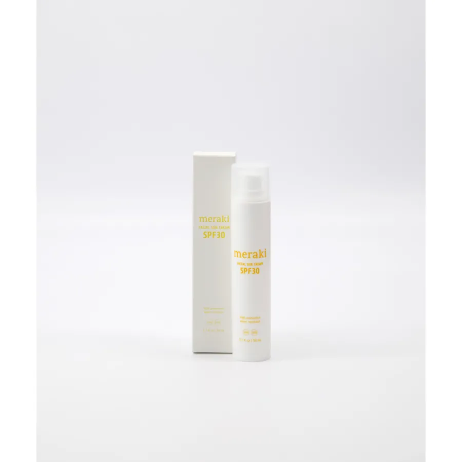 Meraki Facial Sun Cream Mildly Scented SPF 30 er en vandafvisende solcreme specielt udviklet til ansigtet. Den indeholder kemiske UVA- og UVB-filtre, der effektivt absorberer solens skadelige stråler, uden at efterlade hvide striber eller en fedtet fornemmelse på huden. Beriget med E-vitamin og aloe vera, fugter og plejer den huden, hvilket hjælper med at holde den blød og smidig, selv under solbadning.