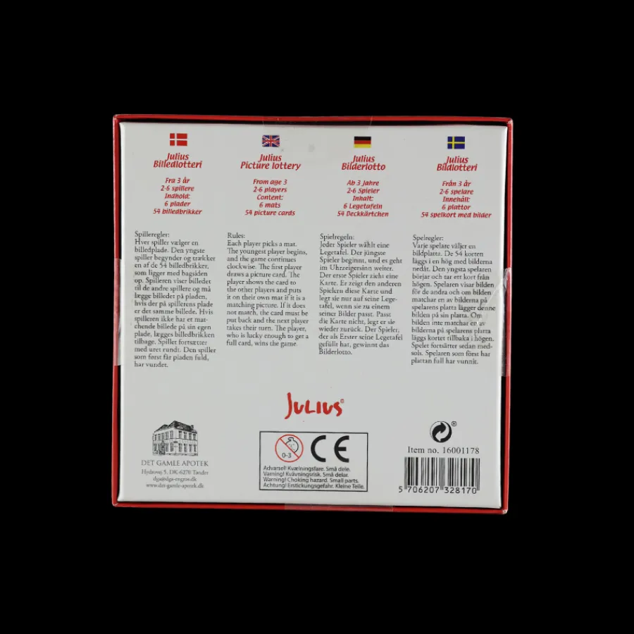 Julius Billedlotteri Sæt er et hyggeligt og sjovt spil, der samler hele familien omkring bordet i juletiden. Med farverige illustrationer af Julius og hans venner får spillet en ekstra julemagisk stemning, der gør det oplagt til adventshygge eller som aktivitet i juledagene. Sættet indeholder spilleplader og billedbrikker, hvor det gælder om at finde og matche de rigtige motiver. Spillet styrker både hukommelse, koncentration og glæden ved at spille sammen. Perfekt som julegaveidé eller som en del af familiens faste juletraditioner.