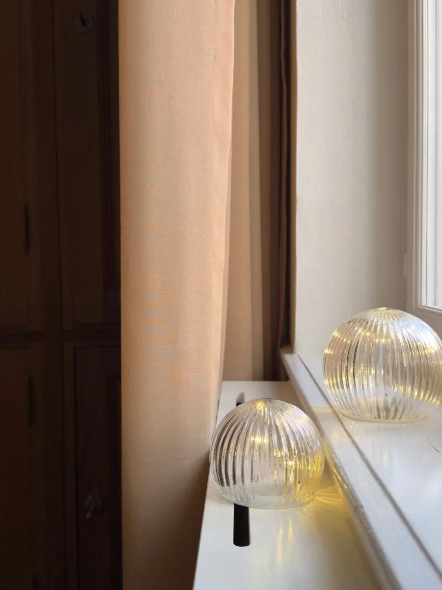 Lille Glas Kugle med LED (Ø10 x 7,5 cm) tilføjer en elegant og moderne touch til ethvert rum. Denne smukke kugle er perfekt til at skabe en hyggelig atmosfære, uanset om det er i stuen, soveværelset eller på skrivebordet. Den bløde belysning fra den indbyggede LED-lampe giver en varm glød, der komplementerer dit boliginteriør og skaber en indbydende stemning. Den enkle, men stilfulde design gør, at kuglen passer ind i både moderne og klassiske indretninger. Brug den som en centerpiece på dit spisebord, eller lad den pryde din hylde for at tilføre karakter til dit hjem. Uanset hvor den placeres, vil Lille Glas Kugle med LED fungere som et iøjnefaldende element, der løfter indretningen. Gør dit hjem til et stille og elegant fristed med denne dekorative løsning.