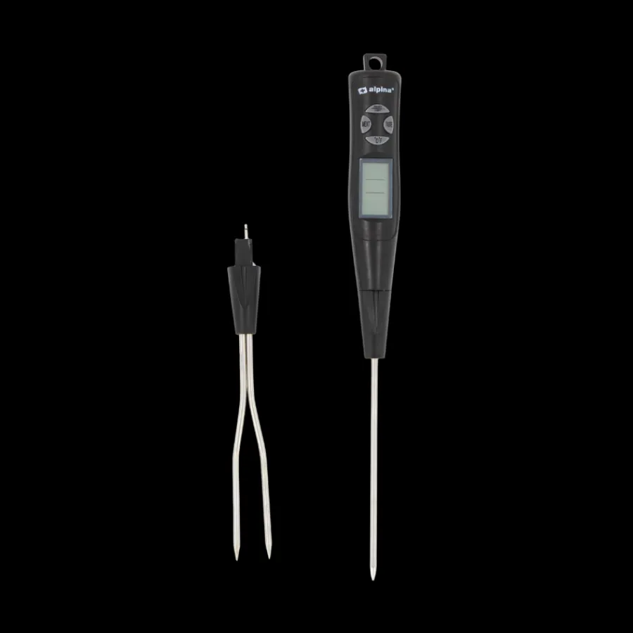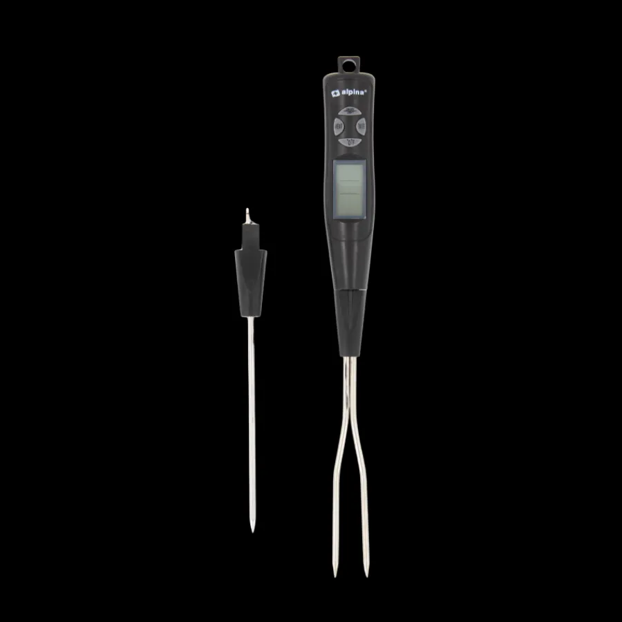 Den måler op til 120 grader, og passer dermed til forskellige tilberedningsmetoder. Det digitale display, udstyret med baggrundsbelysning til svagt lys, viser realtids-temperaturer med præcision. Alpina Stegetermometer har forudindstillede indstillinger for forskellige typer kød og tilberedningspræferencer. Vælg nemt kødtype og ønsket stegegrad med brugervenlige knapper. Termometerets to rustfrie stålprober, en nål og en gaffel, sikrer lang levetid og hygiejne. Rustfrit stål, kendt for sin holdbarhed og modstandsdygtighed over for korrosion, er et ideelt materiale til køkkenredskaber.