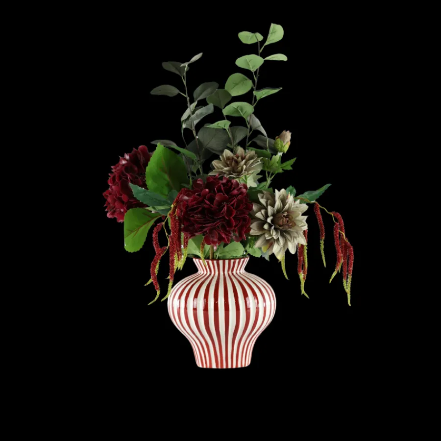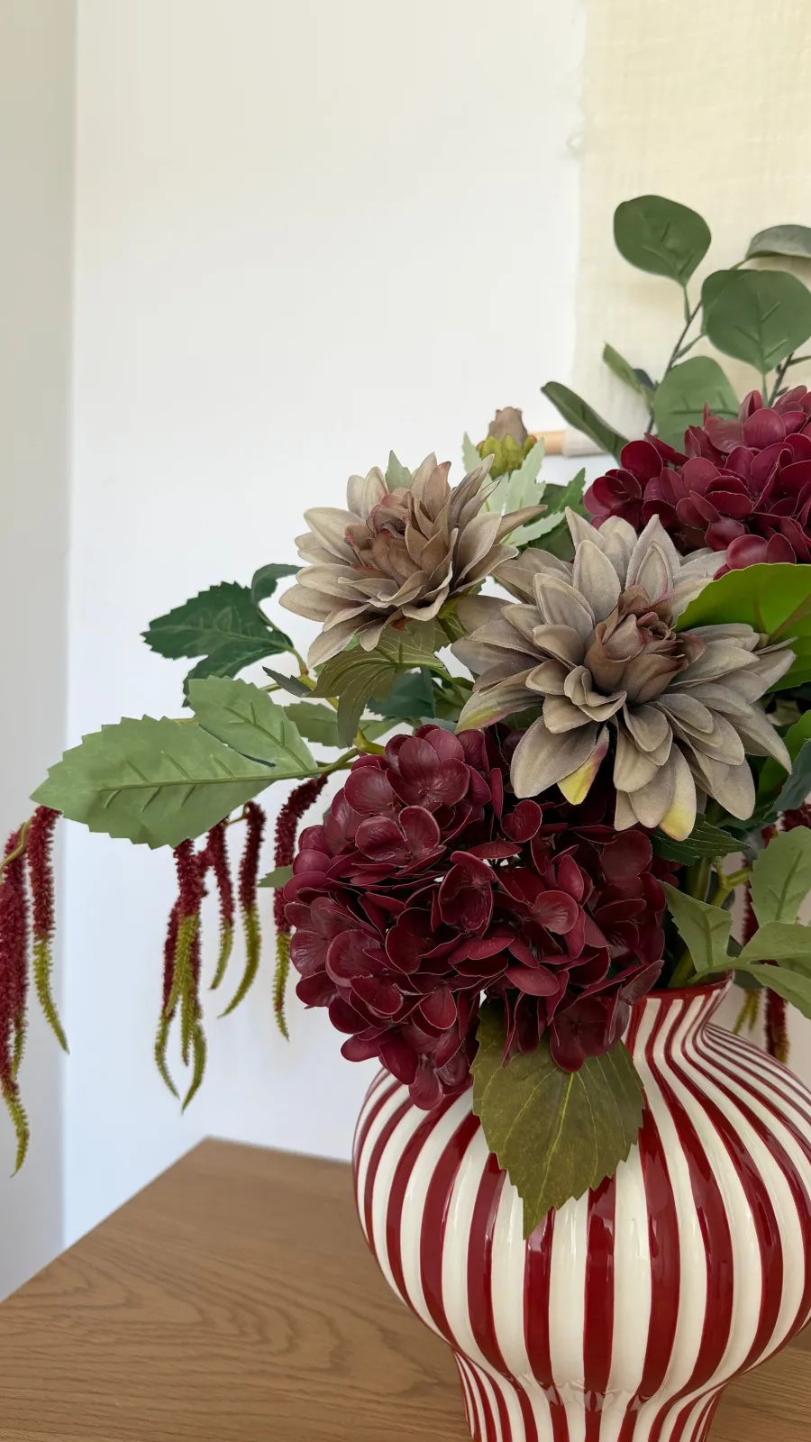 Evighedsbuket Rød Harmoni m. Hortensia og Dahlia emmer af varme og karakter. De dybe bordeaux farver kombineret med de lysegrønne dahliaer skaber en smuk kontrast, der giver et stemningsfuldt udtryk. De grønne eucalyptusgrene og røde græsstrå tilfører buketten et naturligt løft og gør den perfekt i stuen, på spisebordet eller i entréen. En tidløs buket, der holder sig elegant hele året uden behov for vanding.