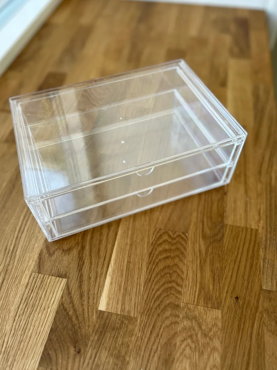 Makeup Organizer med 2 skuffer i størrelsen 22,5x17x9,7cm er den perfekte løsning til at holde dit makeup-univers pænt og ordentligt. Med sit stilfulde design og gennemsigtige materiale giver den ikke blot et elegant udtryk, men gør det også let at finde de produkter, du bruger dagligt. Det rummelige design har plads til alt fra læbestifter til foundation og sikrer, at dine produkter er beskyttede mod støv og skader. Denne organizer er ideel til både badeværelset og toiletbordet, hvilket muliggør en praktisk og smuk opbevaringsløsning.