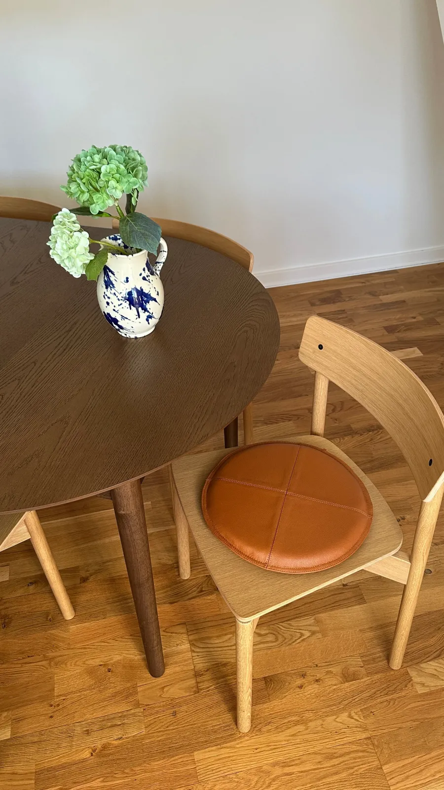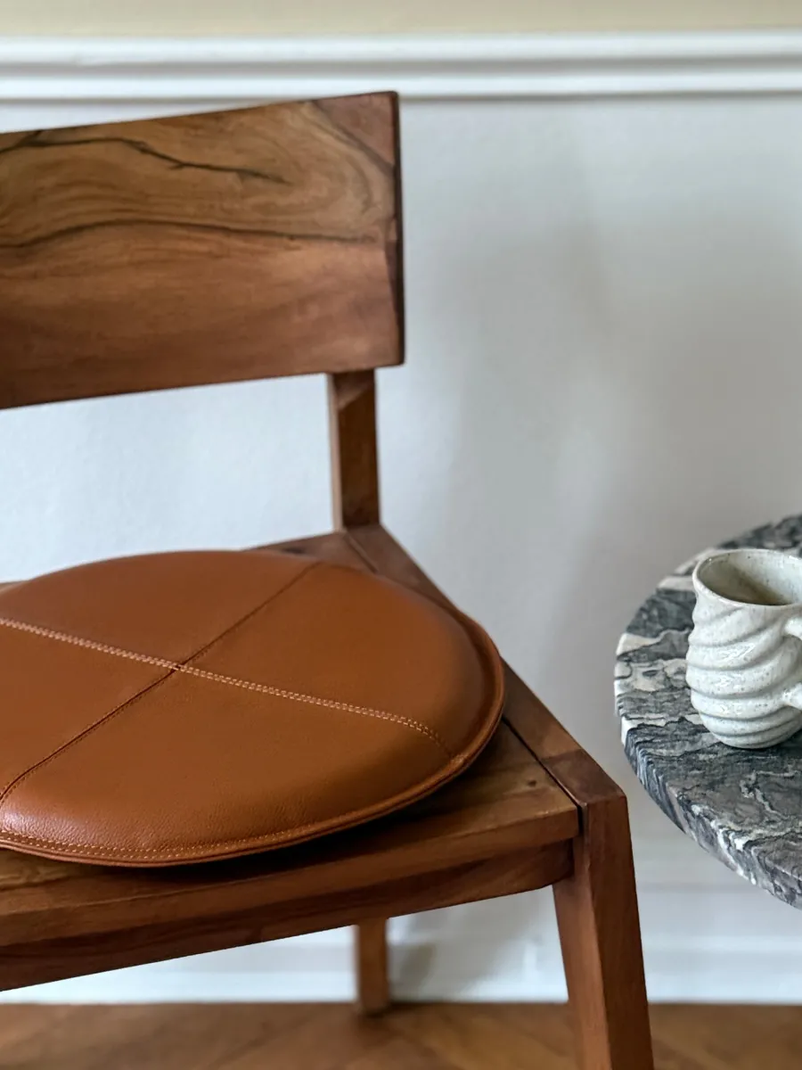 Rund skindpude i cognac tilfører varme og elegance til enhver indretning. Den smukke cognacfarve fremhæver skindets naturlige struktur og giver et eksklusivt udtryk, der passer perfekt til både klassiske og moderne hjem. Puden er ideel som siddekomfort på spisebordsstole, bænke eller som dekorativ detalje i stuen. Det ægte koskind bliver kun flottere med tiden og tilføjer karakter og dybde til rummet.