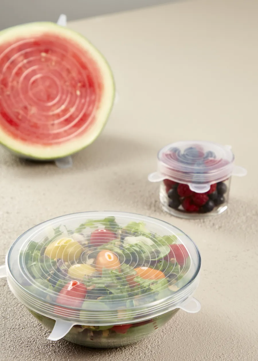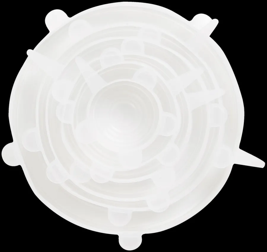 Dette sæt med seks universallåg fra DAY er et praktisk tilbehør til dit køkken. Lavet af fødevaregodkendt silikone, passer disse låg til skåle og madbeholdere i forskellige størrelser, fra Ø6 cm til Ø19,5 cm. De er sikre at bruge i mikroovn, opvaskemaskine og fryser. Perfekt til opbevaring af mad og holder dine retter friske.