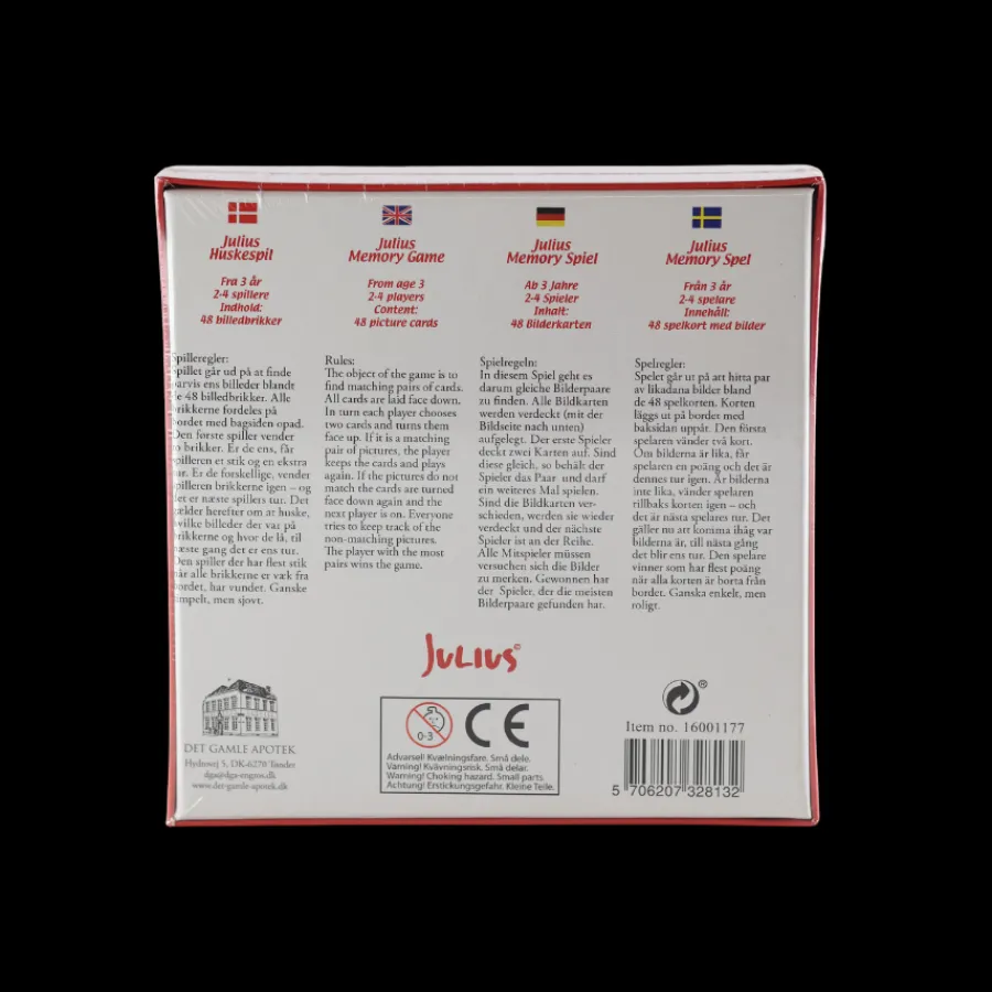 Julius huskespil er et hyggeligt familiespil, der samler både børn og voksne omkring sjov og læring. Spillet består af 48 brikker med søde og genkendelige julemotiver fra Julius’ univers, som skal matches to og to. Det er let at lære og styrker både hukommelse og koncentration på en underholdende måde. Spillet kan spilles af 2-4 deltagere og er velegnet til børn fra 3 år og opefter. Med sit farverige og nostalgiske design er det oplagt som et hyggeligt indslag i juletiden, hvor man kan samles om en sjov aktivitet, der bringer smilet frem hos alle generationer.