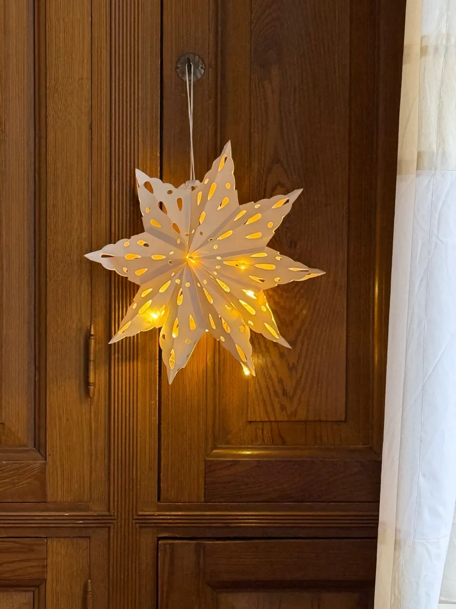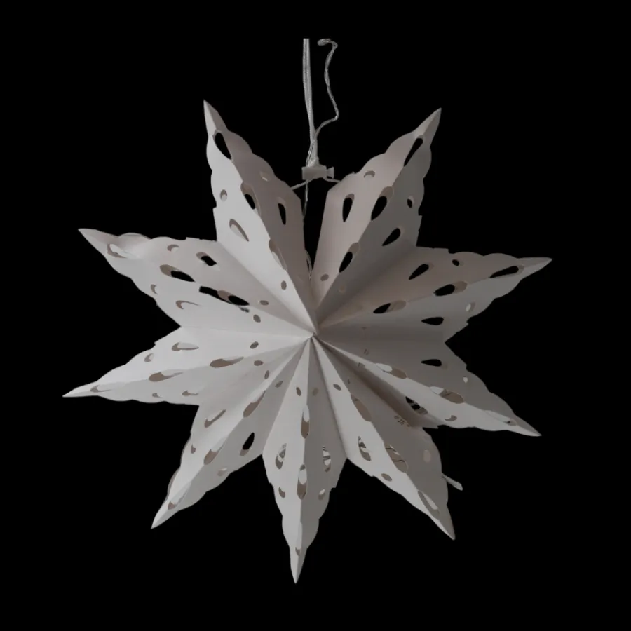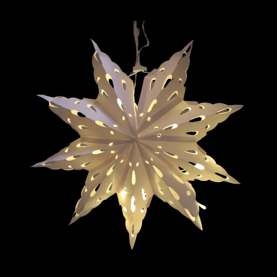 Papirsstjerne til ophæng med 10 LED-lys (Ø35cm) tilføjer et magisk touch til dit hjem. Med sin elegante og filigran design kan denne stjerne transformere ethvert rum og skabe en hyggelig atmosfære. De integrerede LED-lys bringer varme og blød belysning, perfekt til både hverdagsbrug og festlige anledninger. Lavet af kvalitetspapir, er stjernen let at hænge op og kan placeres i vinduer, loft eller på vægge for maksimal visuel effekt. En stilfuld og dekorativ løsning, der passer ind i enhver indretning, ved at kombinere moderne æstetik med klassisk charme. Uanset om det er til jul, en fødselsdag eller bare for at give dit hjem et særpræg, vil denne papirstjerne helt sikkert imponere. Gør dit hjem til et sted fyldt med lys og inspiration med denne smukke og funktionelle dekoration.